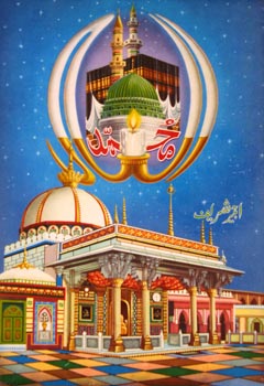 An illustrated book by Yousuf Saeed, 2012, 2019 (2nd edition with a new Afterword), Routledge India An illustrated volume on the history of Islamic popular devotional art and visual culture in India with an emphasis on religious pluralism as part of the iconography. An illustrated monograph on the history of Islamic popular devotional art and visual culture in 20th century India, which weaves the personal narrative of the author’s journey through his understanding of the faith with his research about the making of such devotional art and its use by the masses. The book begins with the coming of the earliest images of Mecca/Medina into India and their dissemination by the print industry along with the pictures of local Sufi shrines and saints, and moves on to explore the adaptation of local Indian icons and symbols into Islamic iconography. Besides providing a historical context of the pre-print culture of popular Muslim visuality, the book also explores the impact the 1947 Partition of India may have made on the calendar art in south Asia – much of Indian popular art leaning more towards Hindu nationalism and leaving the Muslim art mostly with apolitical themes, while Pakistani poster art surprising maintaining the syncretism of Sufi saints and folklore. The last section is a short introspection on why such a vibrant visual culture continues to thrive among South Asian Muslims despite the questions raised by the orthodoxy on its legitimacy in Islam, and why images and popular visual cultures are inevitable for popular piety despite the orthodox Muslims’ increasing dissociation from them. Purchase the 2nd edition of the book in India/South Asia. US/UK and international edition. Also see: South Asia's Islamic Popular Art, a full-colour booklet by the same author, 2019. Some sample images from the author's collection: